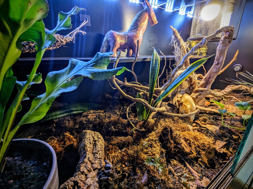Dual Heat Fixture Setup Install two heat lamp fixtures positioned closely together on one side of the enclosure to create a broad, consistent basking zone—ideal for species that benefit from wider thermal gradients.