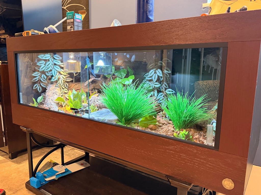 In use: I have a small testudo tortoise inside. Holds humidity and heat well. Glass fogged up a bit at the very beginning, but that settled out after a week or so. Light fixture brackets are great. Perfect UVB with a 12% T5 HO at the substrate level. The faux wood frame looks slightly "plasticky" up close, but at normal viewing distance, it looks great.